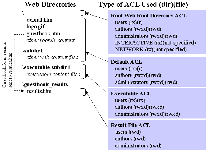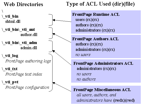 For the complete set of ACLs set on FrontPage files, along with a list of the entire contents of a FrontPage installation, see FrontPage Windows NT File Permissions.