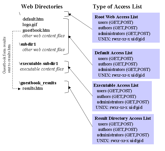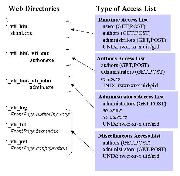An access file in the _vti_bin directory controls access to the run-time FrontPage program shtml.exe. If all users have browse permission, this is set in the access file. Otherwise, the access file points to the list of users and groups with browse access. A separate access file in the _vti_adm directory sets POST permissions for the administrative program admin.exe. A third access file in the _vti_aut directory sets the POST permissions on the authoring program author.exe.